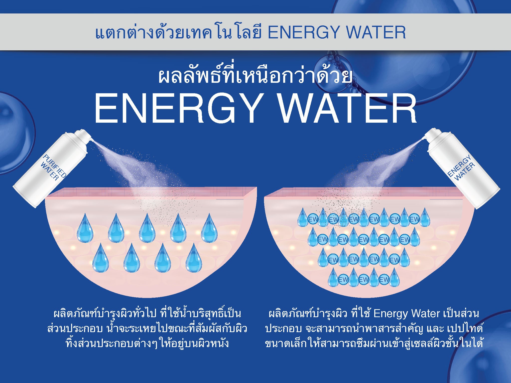 Energy Water เป็นการพัฒนาโมเลกุลน้ำ เพื่อให้เกิดประสิทธิภาพสูงสุดต่อสิ่งมีชีวิต ในการรักษาซ่อมแซมเซลล์เก่า ฟื้นฟูเซลล์ใหม่ ได้อย่างตรงจุด